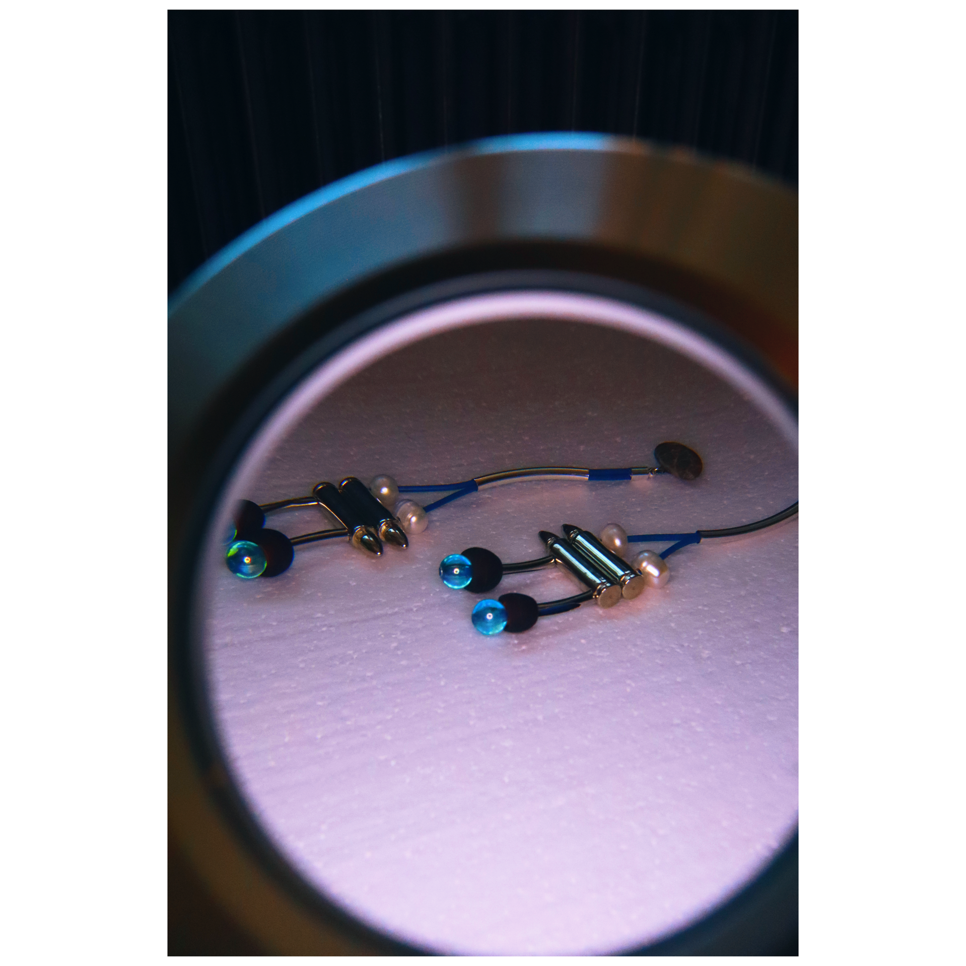Crafted from pebble, genuine leather, mother of pearl, metal-coated plastic bullets, rubber earphone protectors, and acrylic blue beads. Measuring 16 cm in length, yet remarkably lightweight, they move freely with every gesture.