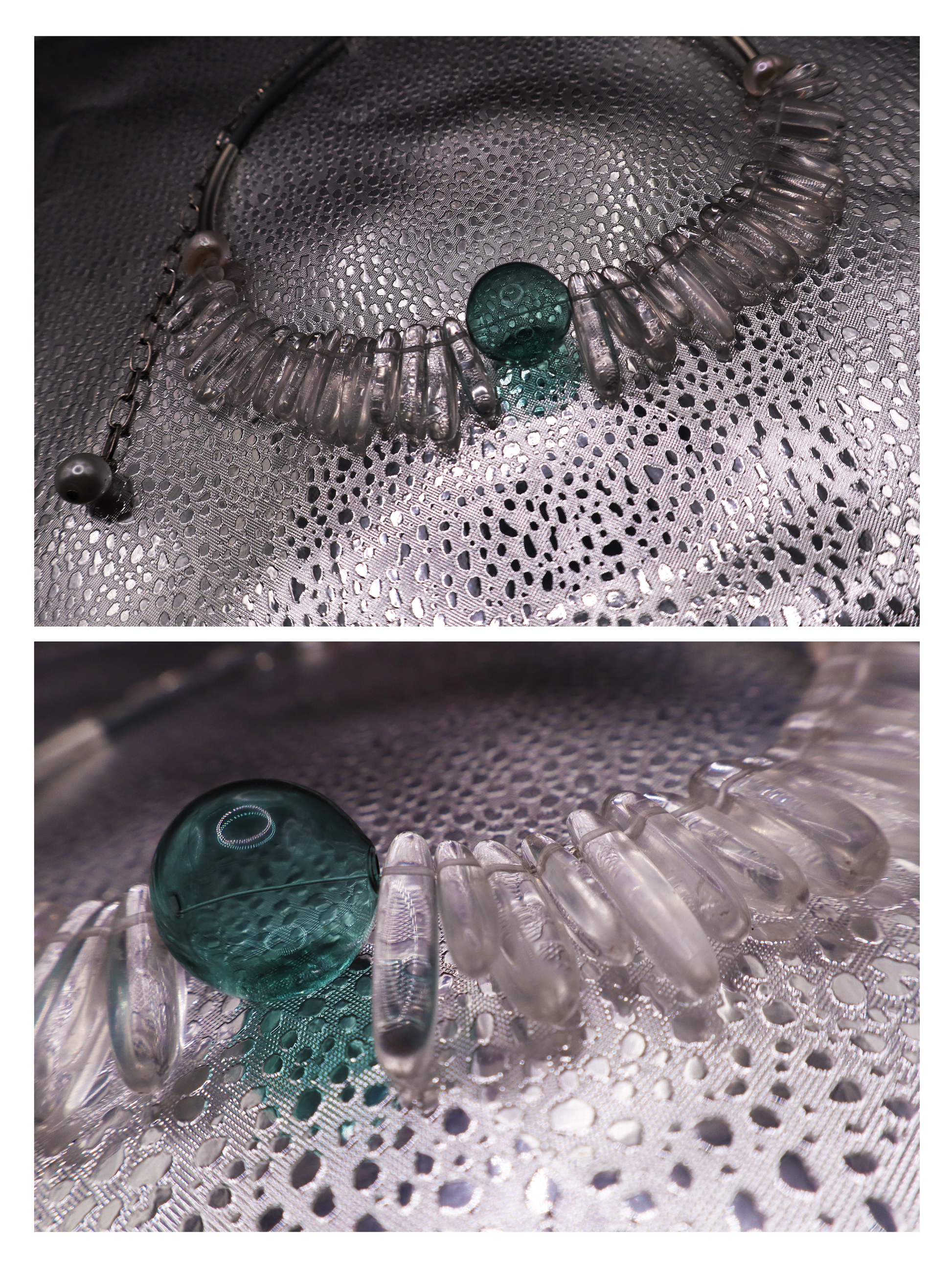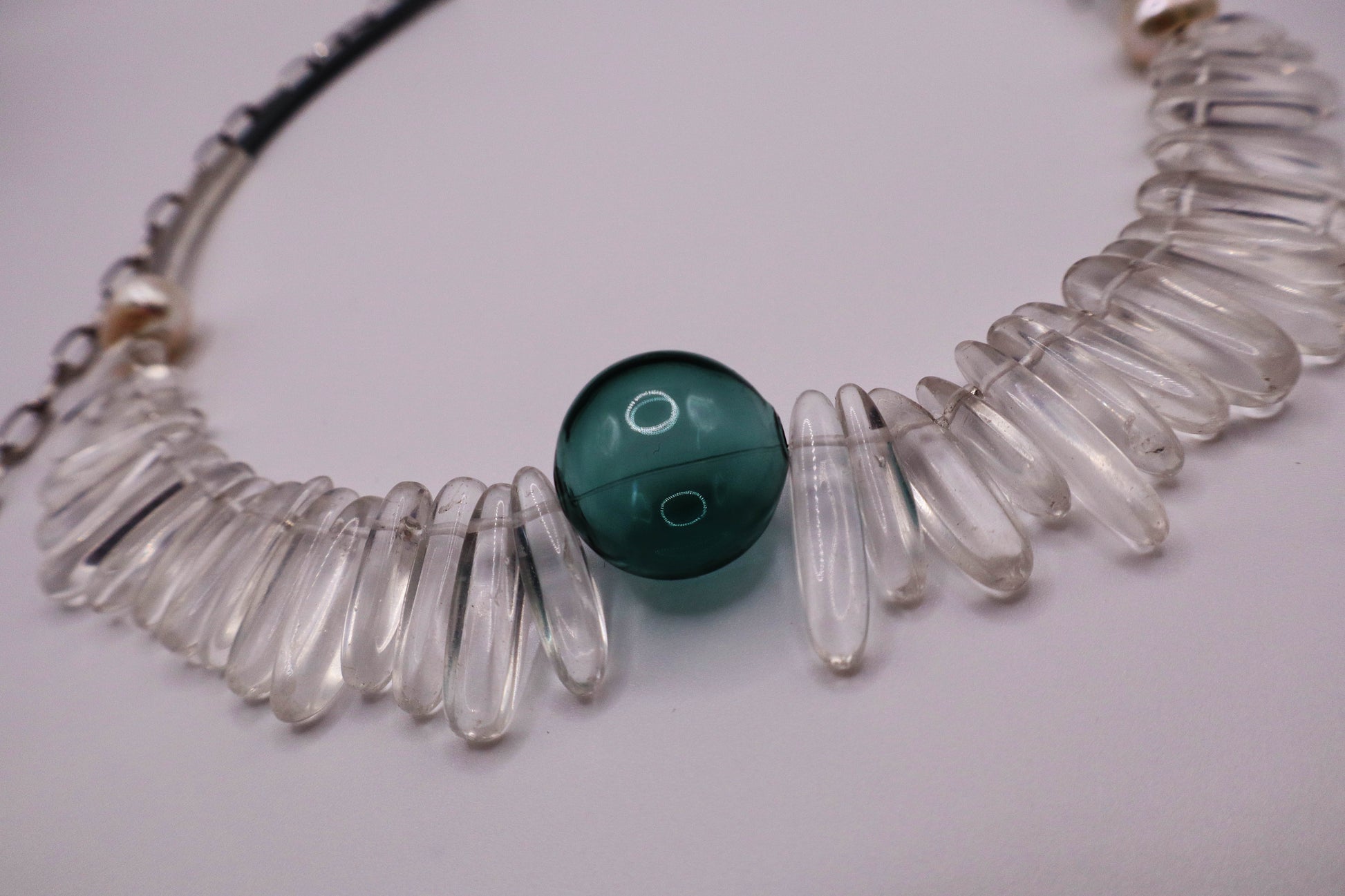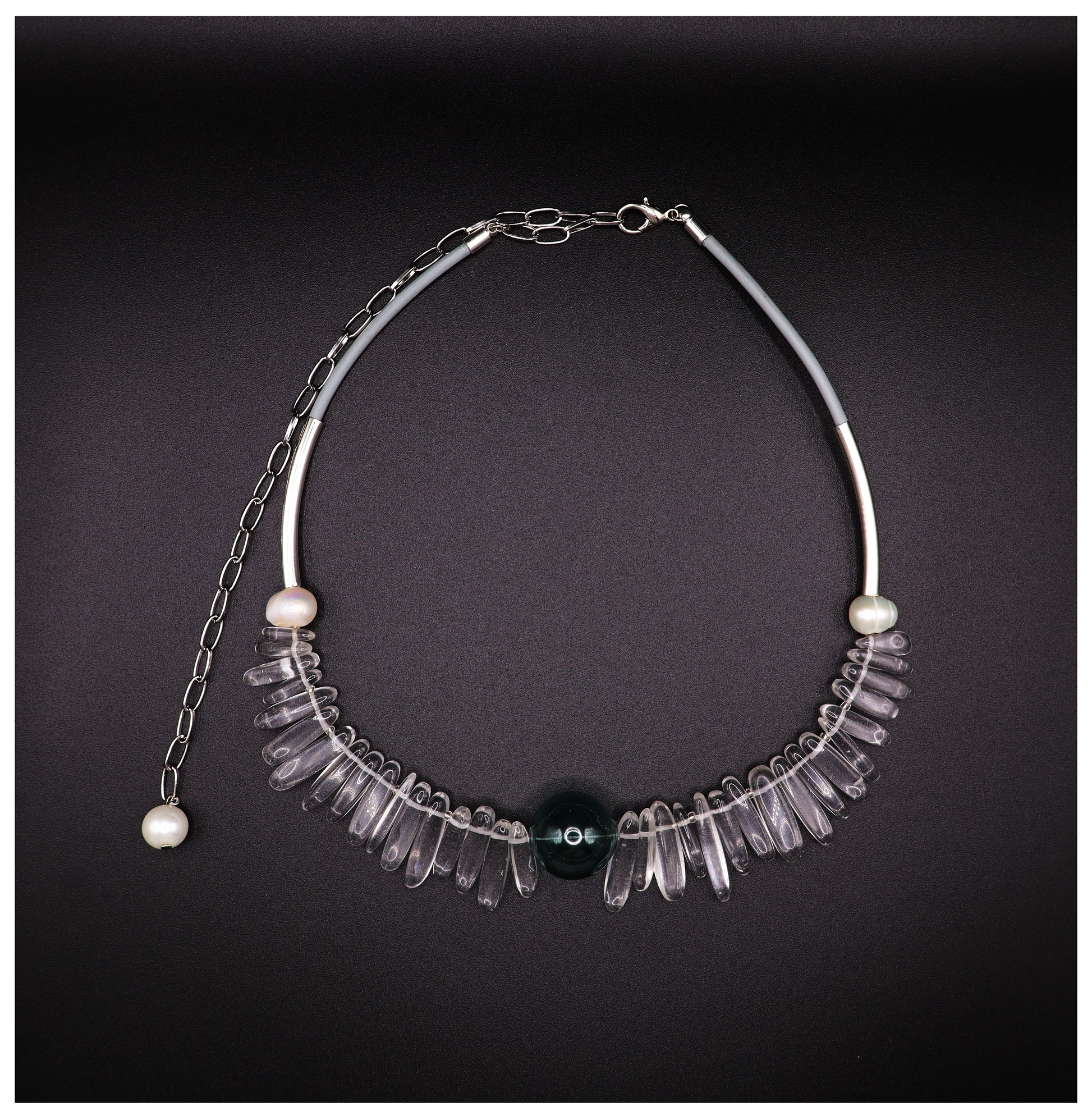 Composed of blown glass, clear quartz, mother of pearl, and a soft rubber cable, this piece balances strength and delicacy in perfect harmony.