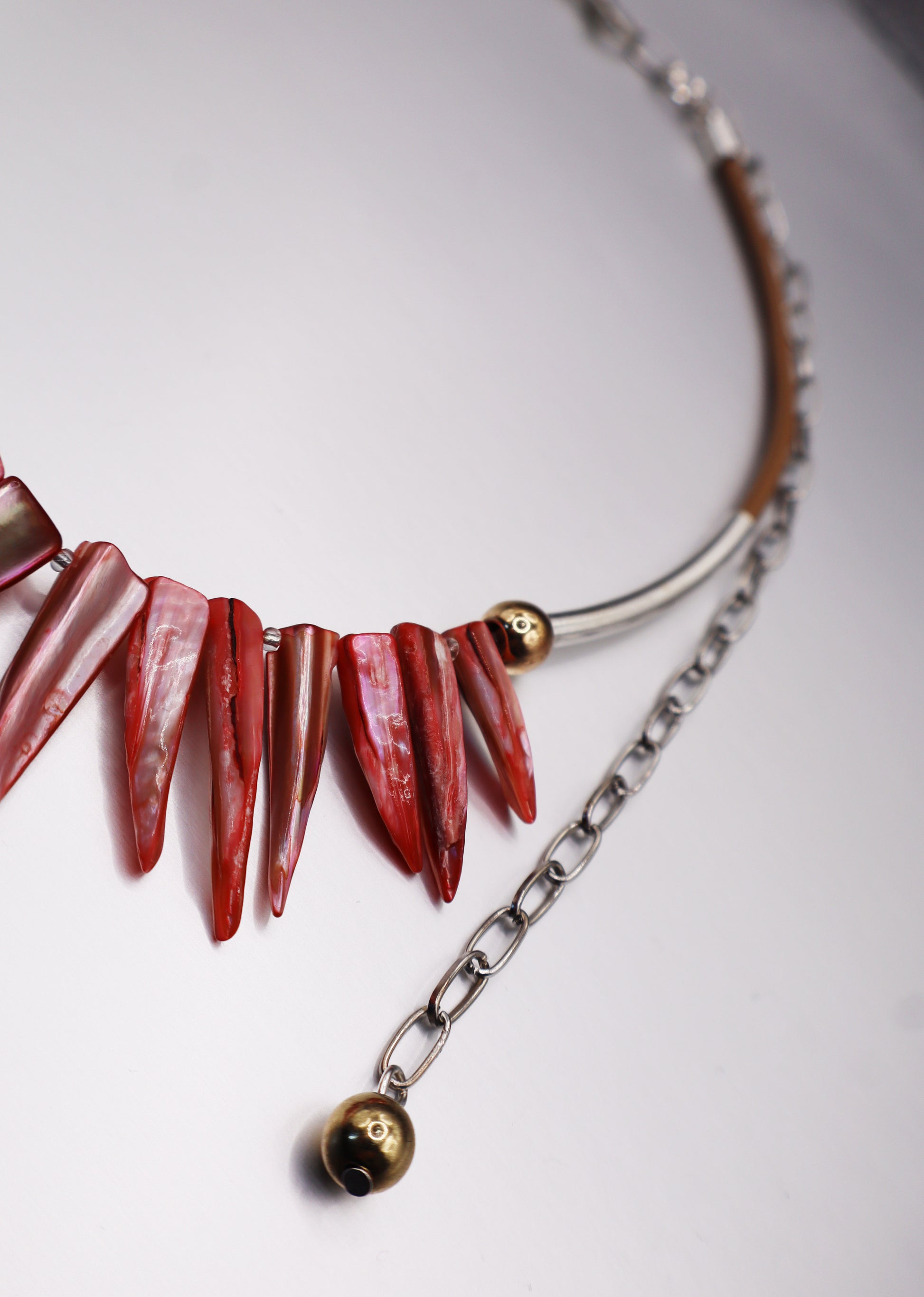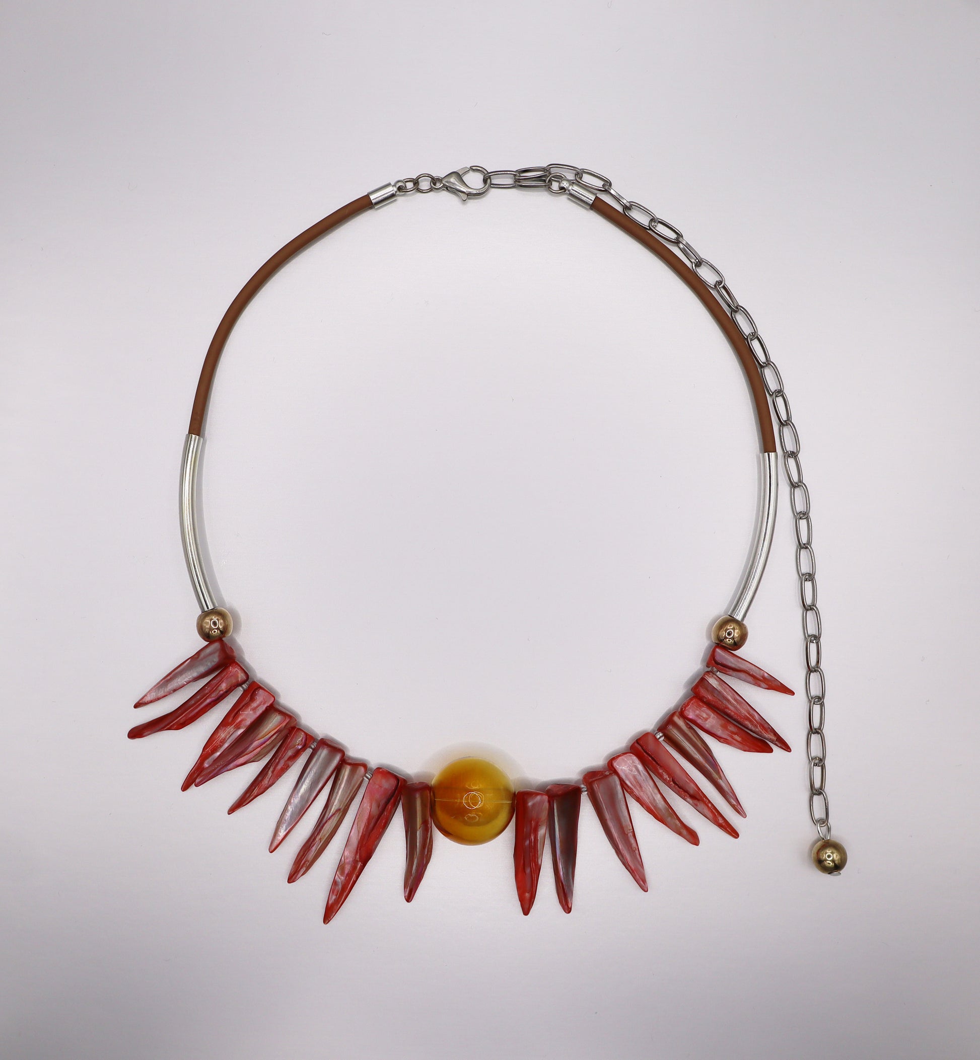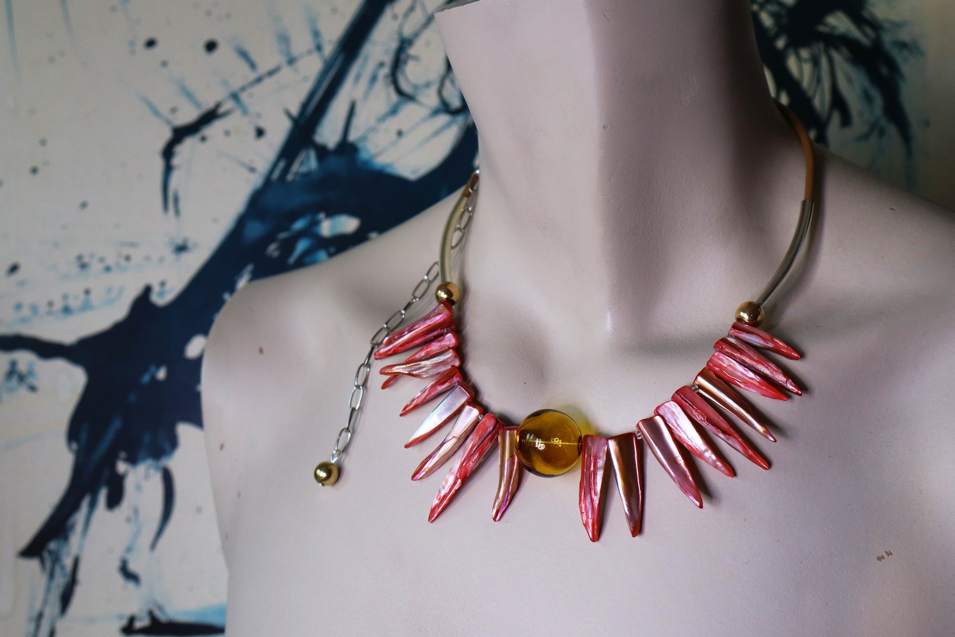 Crafted from blown glass, natural shells, and a soft brown rubber cable, this piece feels almost weightless against the skin.