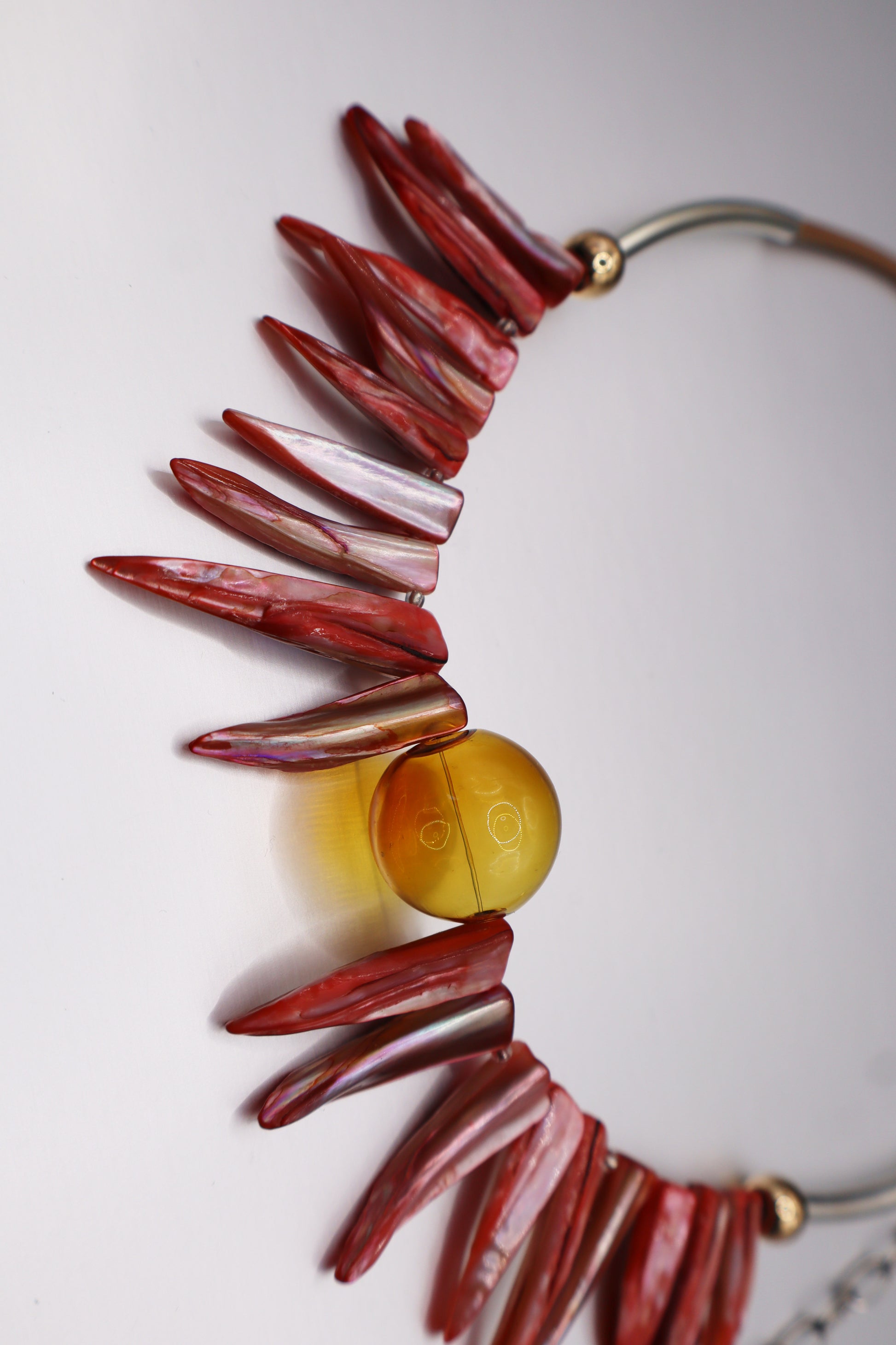 At its center, an orange sphere of blown glass radiates gentle light, surrounded by elongated shell fragments in shades of deep pink and copper - a reflection of autumn’s quiet fire.