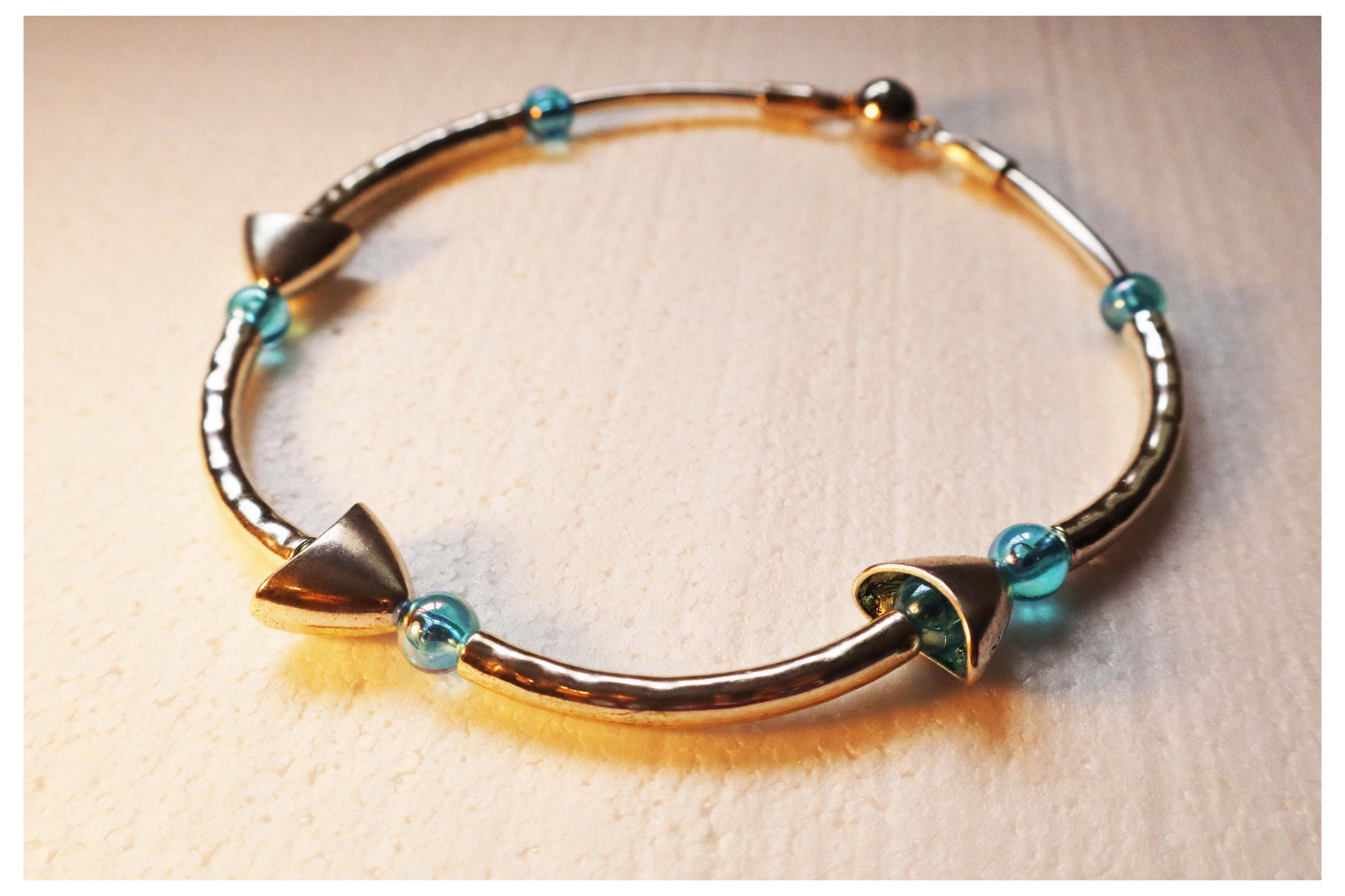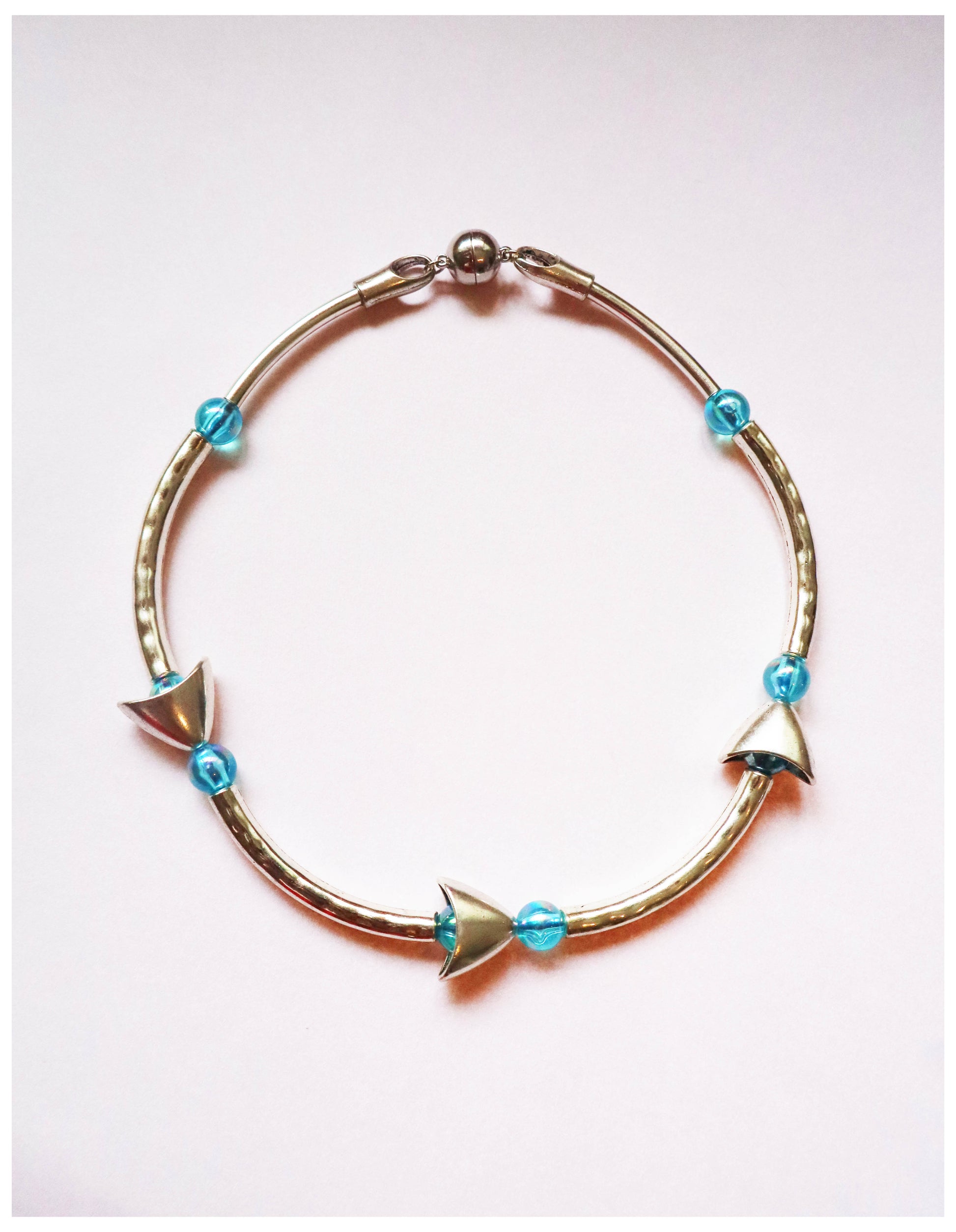 Step into a dreamscape with The Lucid Dreamer Necklace. Silver-plated alloy arcs and sculptural cone forms evoke the whimsical shapes of mushrooms, while translucent aqua acrylic beads add a luminous pop of color. Despite its bold geometry, the necklace is lightweight, comfortable, and designed to be worn all day. A secure magnetic clasp ensures effortless fastening, while at 43 cm in length it sits gracefully at the collarbone, offering a subtle yet distinctive accent that remains effortlessly wearable.