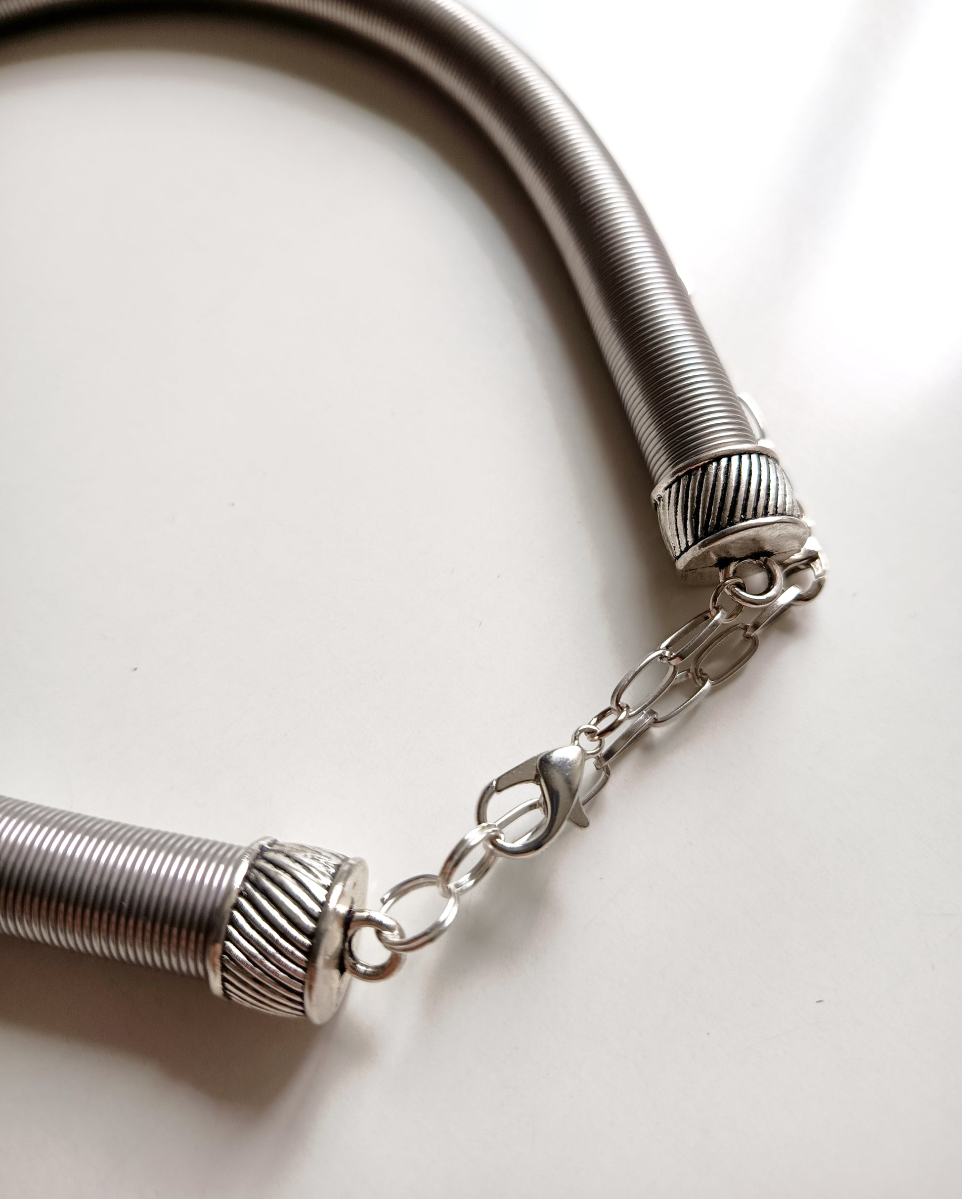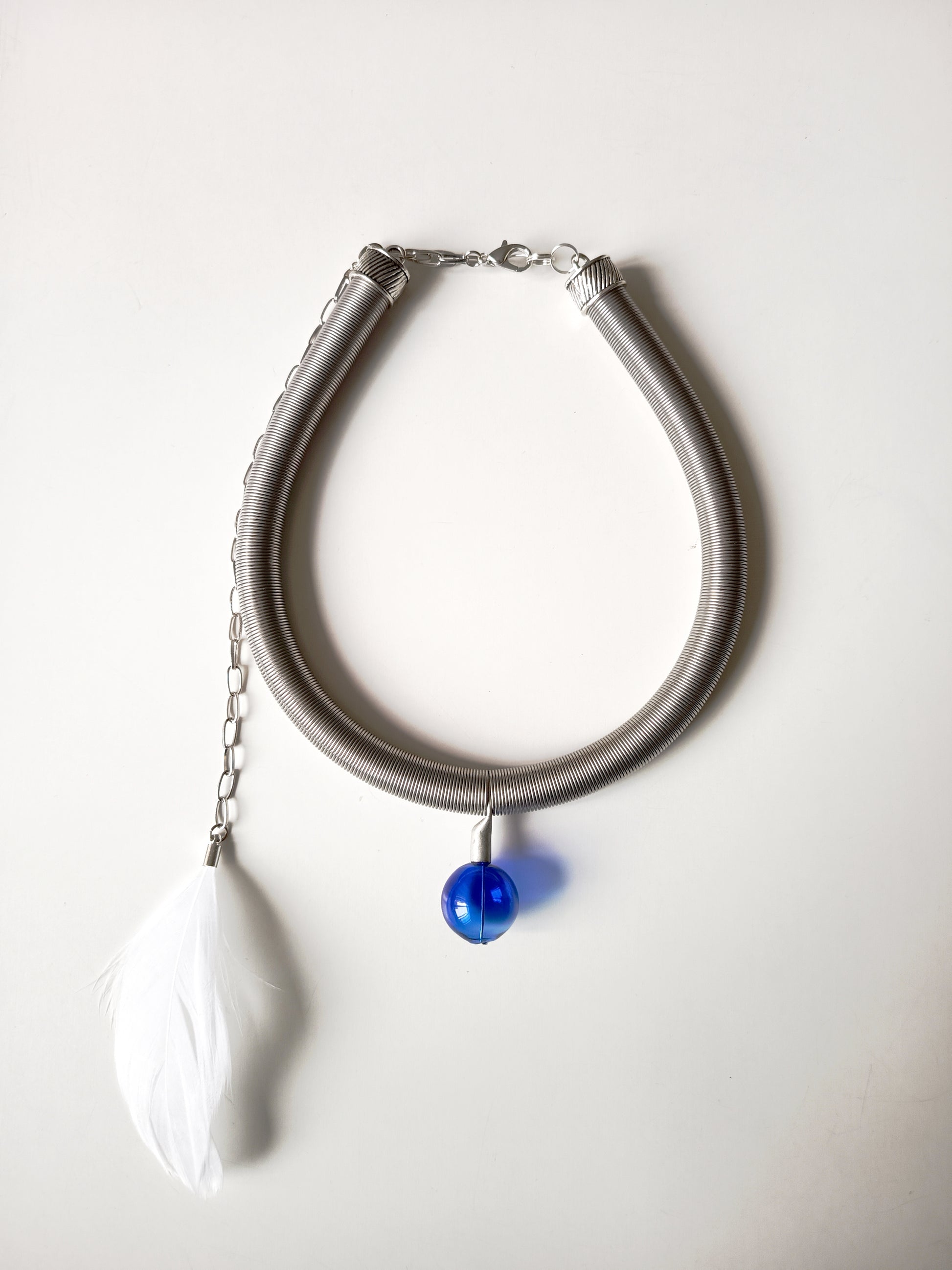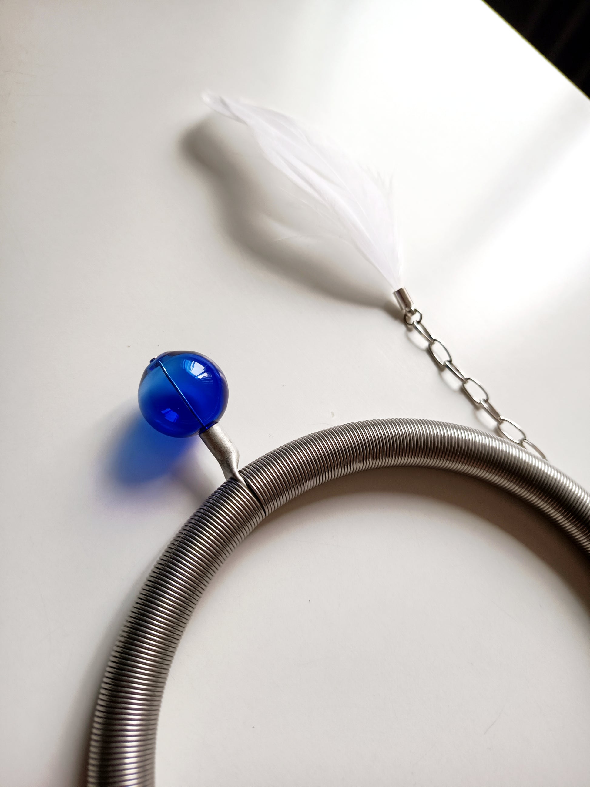 The Protector, besides bringing good luck, is an exceptionally light necklace that exudes elegance and timelessness. It is handcrafted from a lightweight spring tube and a blue blown-glass bead. The white feather can be detached from the chain. The shortest length is 42 cm, and since it is adjustable, it can also be worn longer.